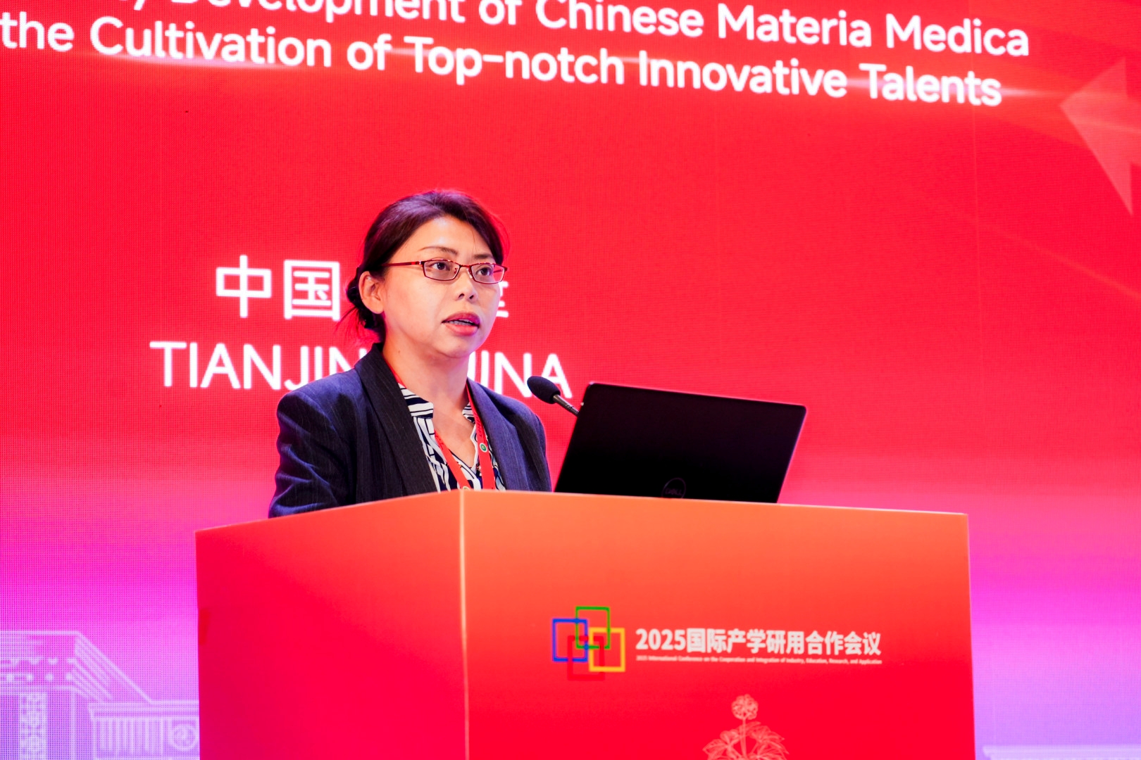 天津中医药大学校长高秀梅教授向大会致辞。她指出,一直以来,中药学院始终面向国家重大战略需求和人民健康需要,在中药资源保护与利用、中药质量标准化、中药新药研发等领域取得了一系列突破性成果。她表示,当前学院正处在中医药发展天时、地利、人和的大好时机,她对中药学院的未来发展提出三点希望:一是要坚持立德树人根本任务,构建高水平人才培养体系。二是要聚焦国家重大战略需求,提升科技创新能力。三是要深化国际交流合作,推动中医药走向世界。她希望中药学院以建院40周年为新的起点,继承优良传统,锐意改革创新,加快建设特色鲜明、国内一流、世界知名的高水平中药学院,为学校“双一流”建设作出新的更大贡献,为中医药事业传承创新发展书写更加绚丽的本草华章。