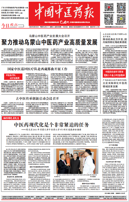 2011年9月20日上午,时任中国科协名誉主席、973计划专家顾问组荣誉组长周光召到天津,考察天津中医药大学承担的973计划项目进展情况。中国工程院院士、时任天津中医药大学校长张伯礼陪同考察。周光召视察了坐落在滨海新区的现代中药研发中心、现代中药国家重点实验室(培育),听取了张伯礼关于973项目方剂配伍规律研究进展汇报,并与项目组研究人员进行了座谈。周光召充分肯定了天津中医药大学科技工作和研究项目组取得的成绩,指出973计划瞄准国家重大需求中的科学问题,在中药创制等重要方面进行部署,具有重要意义。周光召不时地提问和插话引导着话题的深入,最后周光召发表了重要讲话: