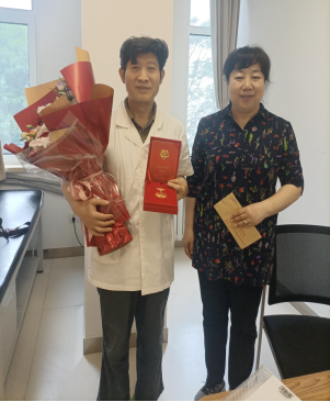 校党委书记刘革生为宋俊生、刘淑珍颁发纪念章