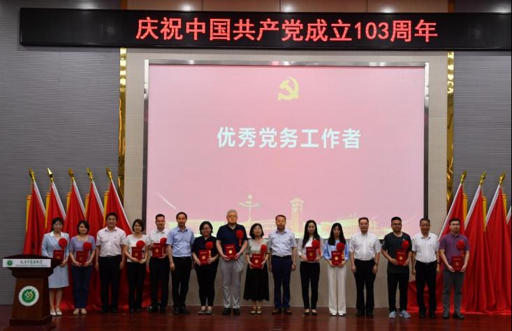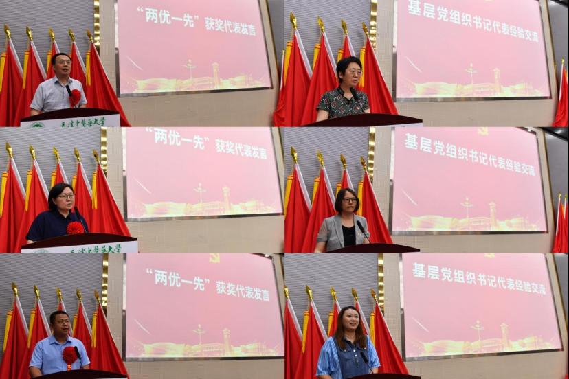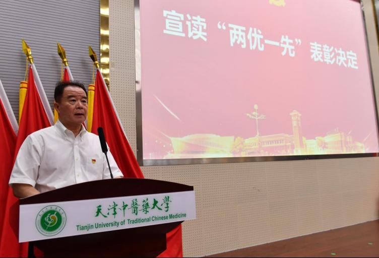 党委常委、副校长王耀刚同志宣读了《关于表彰天津中医药大学优秀共产党员、优秀党务工作者和先进基层党组织的决定》,全校共有49名优秀共产党员、47名优秀党务工作者和20个先进基层党组织受到表彰。校领导依次为“两优一先”受表彰对象颁发了证书和奖牌。优秀共产党员代表第二附属医院封继宏同志、优秀党务工作者代表第一附属医院董桦同志、先进基层党组织代表中药学院李先宽同志先后作了典型发言。