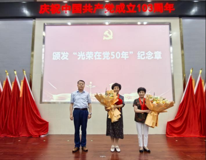校党委书记刘革生为“光荣在党50年”的老党员代表宋俊生、刘淑珍同志颁发纪念章