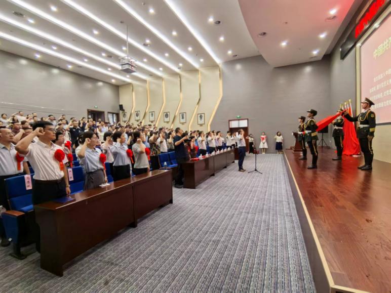 校领导班子成员和两位老党员代表为新党员代表佩戴党员徽章,党委书记刘革生同志带领新党员代表进行入党宣誓,与会党员重温入党誓词。
