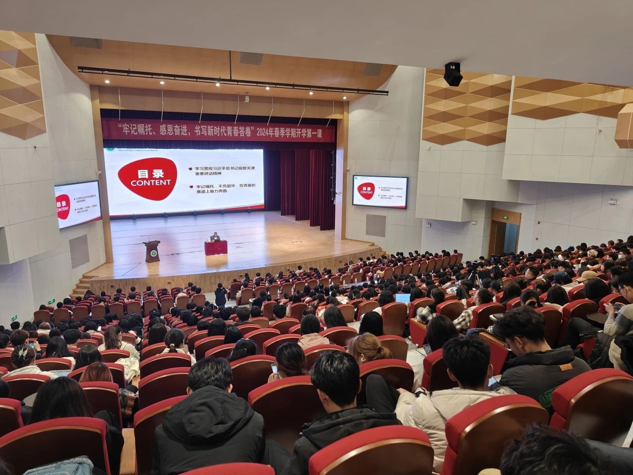 为深入学习贯彻习近平新时代中国特色社会主义思想和党的二十大精神,学习宣传贯彻习近平总书记视察天津重要讲话精神,学习贯彻全国两会精神,4月9日,学校组织《牢记嘱托、感恩奋进,书写新时代青春答卷》2024年春季学期开学第一课。校党委书记刘革生进行授课。学校办公室、党委学工部等相关职能部门负责同志,各二级学院党委副书记、辅导员老师,学生党员、学生骨干、少数民族学生代表等共计650余人参加了学习,讲座由党委学工部部长东晓明主持。