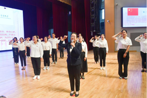校长高秀梅领誓,全体参会老师与新教师一起,面对国旗与校旗宣誓:“忠诚党的教育事业,贯彻党的教育方针,履行教师神圣职责,修身立德,为人师表;追求真理,崇尚科学;敬业爱生,教书育人;淡泊名利,严谨治学;与时俱进,终身学习;秉承‘进德修业,继承创新’校训,为学生全面发展,为学校‘双一流’建设,为实现中华民族伟大复兴中国梦,贡献自己的智慧和力量。”