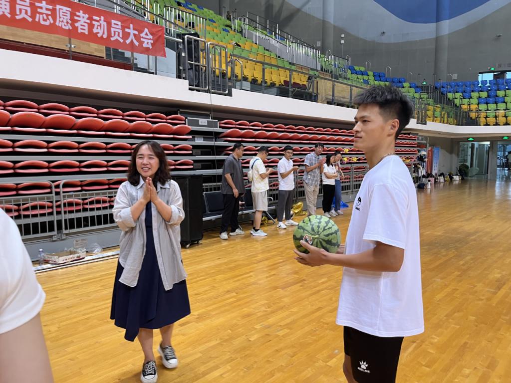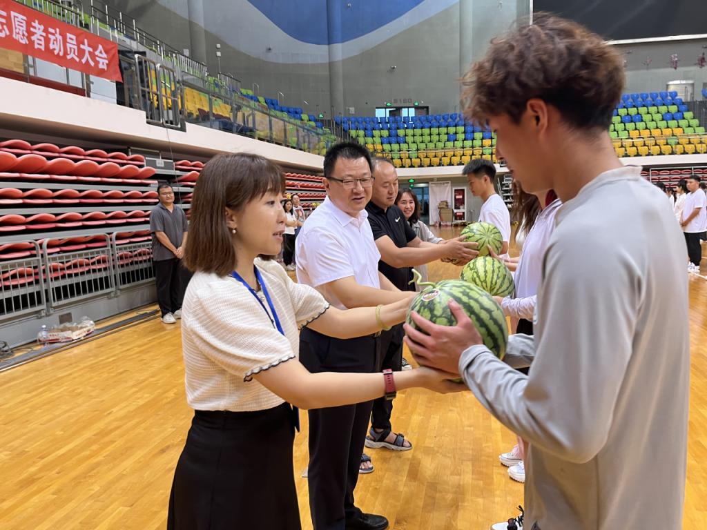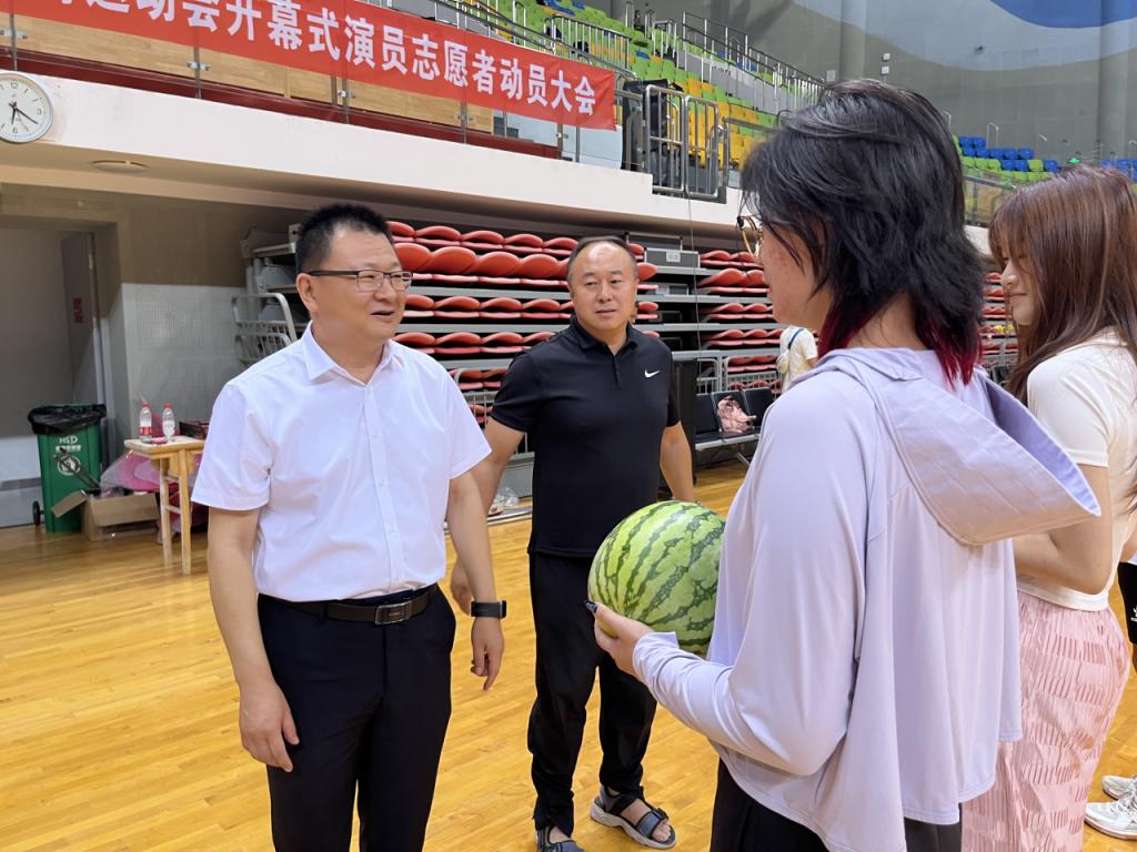 8月1日下午,校党委副书记张华泉同志前往传运会开幕式志愿者训练场地慰问、看望我校开幕式演员志愿者,并为同学们送上防暑降温的西瓜。体育健康学院党总支书记李超、党委学工部部长东晓明、校团委书记张晶、文化与健康传播学院党委副书记张颖、医学技术学院党委副书记李欣,开幕式各节目负责的辅导员教师一同参加。