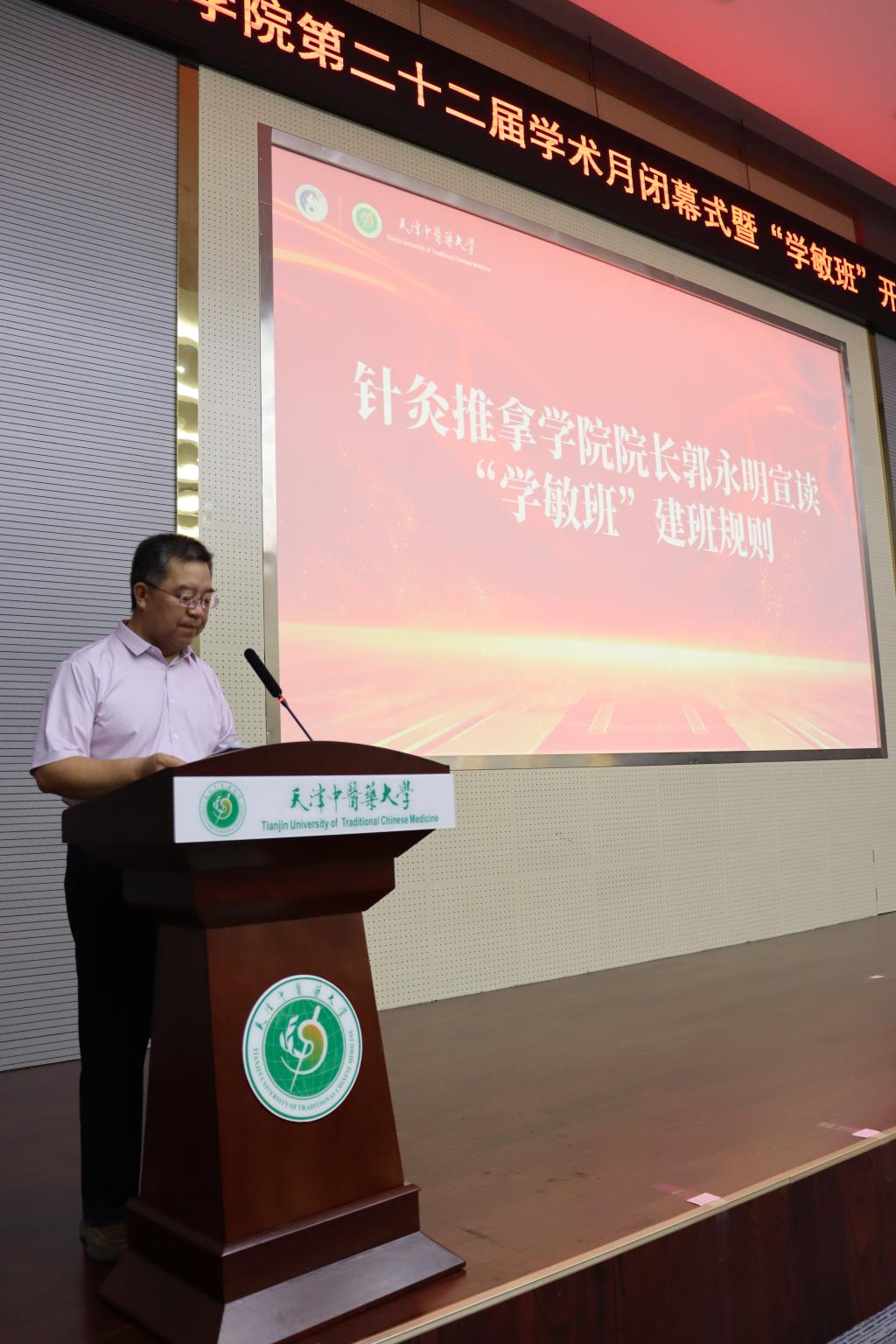 一枚银针贯中西,一缕药香越古今,弘扬中华国粹,传承中医文化,理应行远自迩,笃行不怠。针灸推拿学院贯彻落实党的二十大精神,重视学生发展教育,精心谋划、部署、落实学生教育培养方案,营造良好氛围,进一步增强学生文化自信,强化针推学子的临床思维和人文素养,以敏学勤思之姿,在浩浩学海砺行致远,以多践善悟之态,在漫漫医路知行合一。针灸推拿学院于2023年6月25日下午,举办针灸推拿学院第二十二届学术月闭幕式暨“学敏班”开班仪式。天津中医药大学校长高秀梅教授、副校长郭义教授、校党委常委宣传部崔强部长、天津中医药大学第一附属医院针灸部部长杜宇征教授,校党委学工部东晓明部长、校团委张晶书记、学敏班导师、针灸推拿学院全体教师及学生代表共计200余人参加了此次活动。
