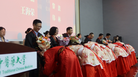 与会领导为24名导师颁发聘书,“学敏班”20级、21级学子依次上台向导师行拜师礼,拜师会上导师向学生赠书,《针灸治疗学》封页赫然印下的“石学敏”红章是对每一位同学殷切的期盼。