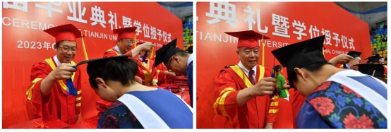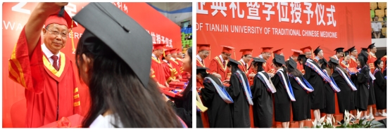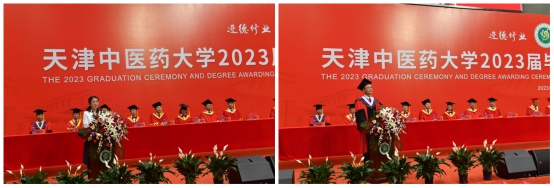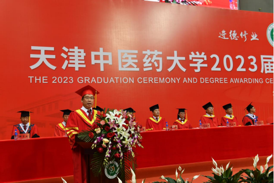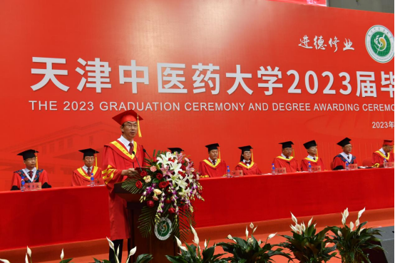 在雄壮的中华人民共和国国歌声中毕业典礼拉开帷幕。校党委副书记李鑫同志宣读关于表彰天津中医药大学2023届优秀毕业生、优秀毕业研究生的决定。副校长邱峰教授宣读2023届毕业生学位授予决定。