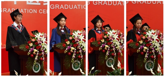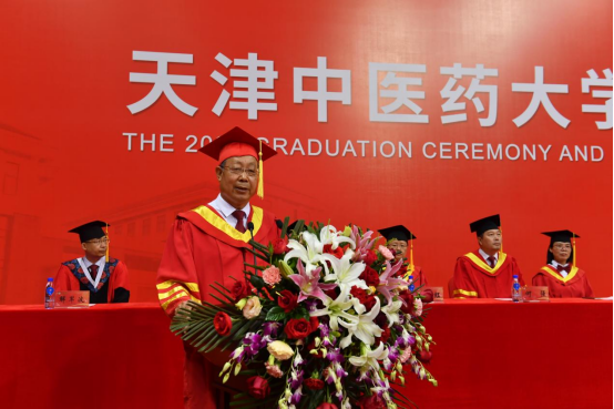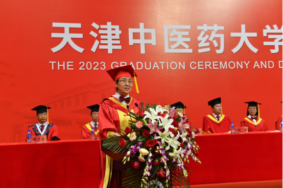 典礼上,本科毕业生代表中药学院2019级中药创新班徐晟源、硕士毕业生代表2020级中药学杨昕彤、博士毕业生代表2020年天津市大学生年度人物2020级中医内科学李珠在发言中回忆了青葱岁月里,在师长的谆谆教导下,与同学们一起在教学楼、天圆地方广场、如意药岭、旋衡体育馆和实习医院、中医药研究院、挑战竞赛、社会服务中奋斗拼搏、追逐梦想、激情挥洒的成长足迹。如今,同学们满载收获和憧憬,即将奔赴山海、开启崭新征程。