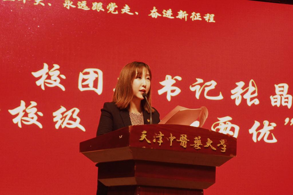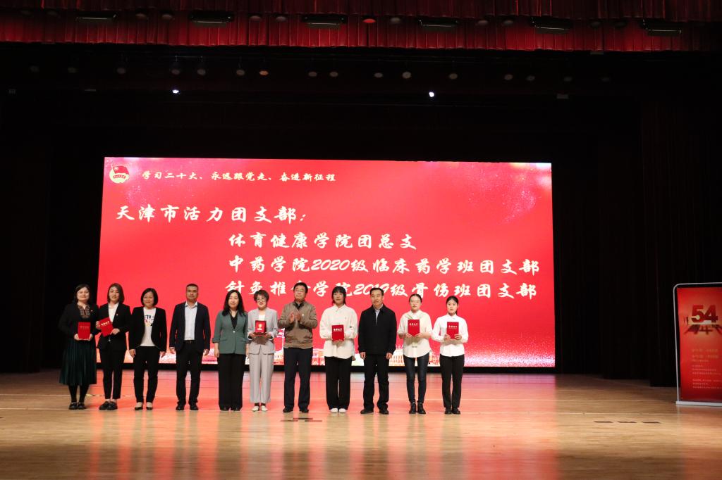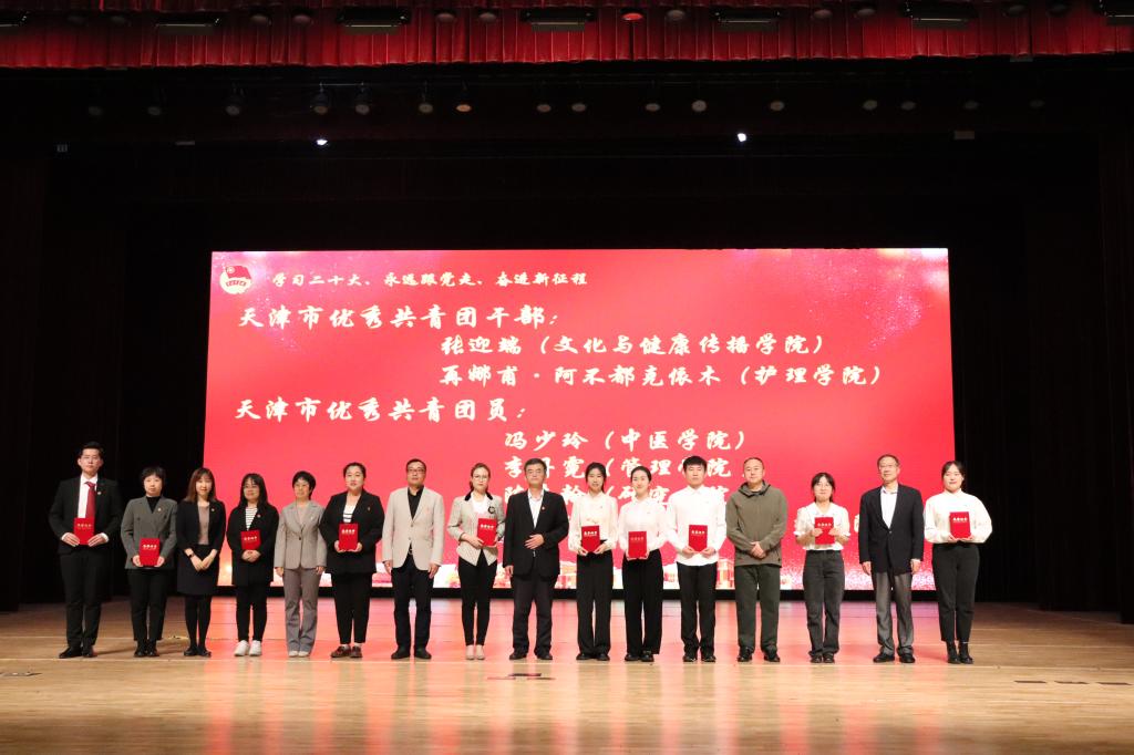 随后,校党委副书记李鑫同志为全国青年文明号集体颁发荣誉奖牌;党委宣传部部长崔强同志、党委组织部部长朱莹同志、党委办公室主任曹永兴同志、一附院党委副书记张志国同志、教务处处长阚湘苓同志等各职能处室领导老师,各学院党政领导为天津青年五四奖章、天津向上向善好青年、天津市活力团支部、天津市岗位技能大比武获奖集体及个人以及天津市“两红两优”获奖先进个人和集体颁发荣誉证书;各学院党委副书记以及团委书记为校级“两红两优”先进个人和集体代表颁发荣誉证书。
