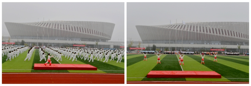 在序幕篇中,全场500名同学表演了太极拳,大家动作整齐划一,一招一式舒展大方、收放自如,气势恢宏、动静相宜,举手投足间洋溢着青春的风采;体育健康学院6位教师带来的八段锦展示,身姿飘逸、招式灵动,行如流水、动如微风,彰显了中华传统体育瑰宝的独特魅力。