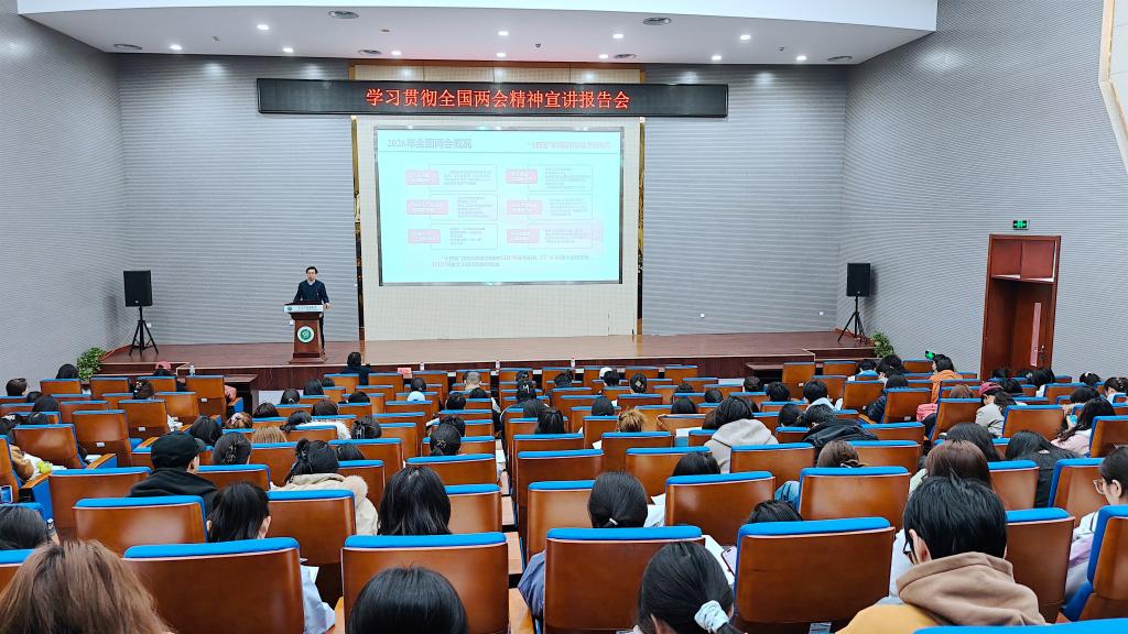 宣讲中,邱峰副校长围绕2026年全国两会概况、政府工作报告、健康中国建设、教育科技人才一体谋划、个人履职情况与体会等方面,全面系统、深入浅出解读两会精神的精髓要义与丰富内涵。
