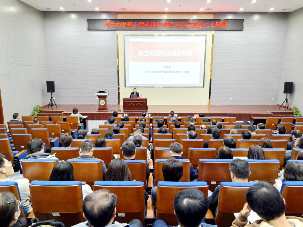 为深入学习贯彻习近平新时代中国特色社会主义思想,推动树立和践行正确政绩观学习教育走深走实,引导党员、干部实干担当、勇挑重担,4月1日下午,天津中医药大学党委开展“杏林干部学习大讲堂”第二十四期,特邀中共天津市委党校哲学教研部副主任李荣亮教授作《树立和践行正确政绩观》专题讲座。校领导班子成员、全体处级领导干部、重点领域关键岗位干部、“双带头人”教师党支部书记代表及党员代表等140余人参加培训。