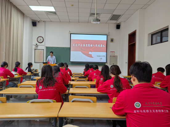 王哲老师结合习近平新时代中国特色社会主义思想和党的二十大精神,围绕习近平法治思想的人民特性,从为了人民、依靠人民、依法保障人民群众利益三个方面进行全面讲述,充分阐述出“坚持以人民为中心”是习近平法治思想的核心内涵,人民立场是习近平法治思想的根本立场。王哲老师通过一系列生动的实例分析,为大家带来了一场多角度、深层次的专题理论培训。他指出,人民性是习近平法治思想最鲜明的品格,在社会主义法治建设的过程中,应努力让人民群众在每一项法律制度、每一个执法决定、每一宗司法案件中都感受到公平正义,作为新时代广大青年,要努力成长为一个学法、知法、守法、敬法的好公民,坚定理想信念,立足实际,为法治中国建设贡献力量。
