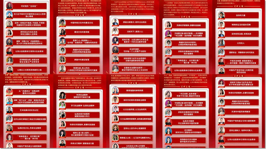 马克思主义学院“理响天中”党员先锋站创新打造9支宣讲团,聚焦习近平文化思想、习近平法治思想、教育家精神等不同主题,为校内、外师生群众提供全方位高精度的理论“大餐”,宣讲团通过一场场透彻深入的理论宣讲,一段段生动鲜活的诠释解读,一次次入心入脑的课堂交流,让党的创新理论直达基层、触动人心,切实让师生汲取精神营养,凝聚起奋进向上的思想共识。目前,宣讲团1名成员获评“天津市新时代文明实践金牌宣讲员”。