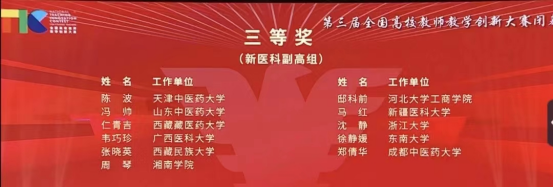 2023年8月18-22日,第三届全国高校教师教学创新大赛在浙江大学举办。我校陈波老师《针灸学》课程团队首次入围大赛国赛,荣获新医科副高组三等奖。
