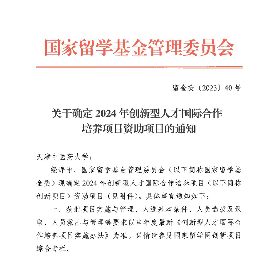 近日,国家留学基金管理委员会发布了《关于确定2024年创新型人才国际合作培养项目资助项目的通知》,由天津中医药大学精心策划及组织申报的“中医药学拔尖创新人才国际合作培养项目”与“针灸交叉创新人才国际合作培养项目”均获批立项。资助项目执行期为三年(2024-2026年)。这是我校首次获批国家级创新型人才国际合作培养项目。