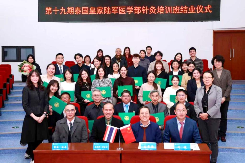 近日,天津中医药大学与泰国皇家陆军医学部联合举办的第19期针灸培训班结业仪式在我校国际教育学院举办。我校校长高秀梅、泰国皇家陆军医学部教育处主任尤塔彭·尹索万上校出席结业仪式,国际交流与合作处\国际教育学院相关负责同志参加。