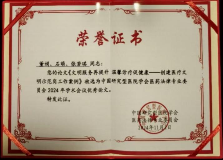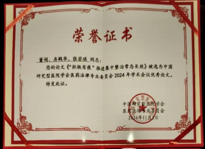2024年11月2日,中国研究型医院学会法律专委会2024年学术会议在江苏省镇江市召开,此次学术会议的主题为“廉洁从业,合规运营,高质量发展”。国家卫生健康委员会、中国研究型医院学会、江苏省医师协会等部门领导及全国25个省(自治区、直辖市)医疗机构及医药法律领域150余人参加会议。会议共评选出16篇优秀论文,我校第一附属医院《“抓铁有痕”推进集中整治常态长效》《文明服务再提升 温馨诊疗促健康》两篇论文荣获学术会议优秀论文奖。