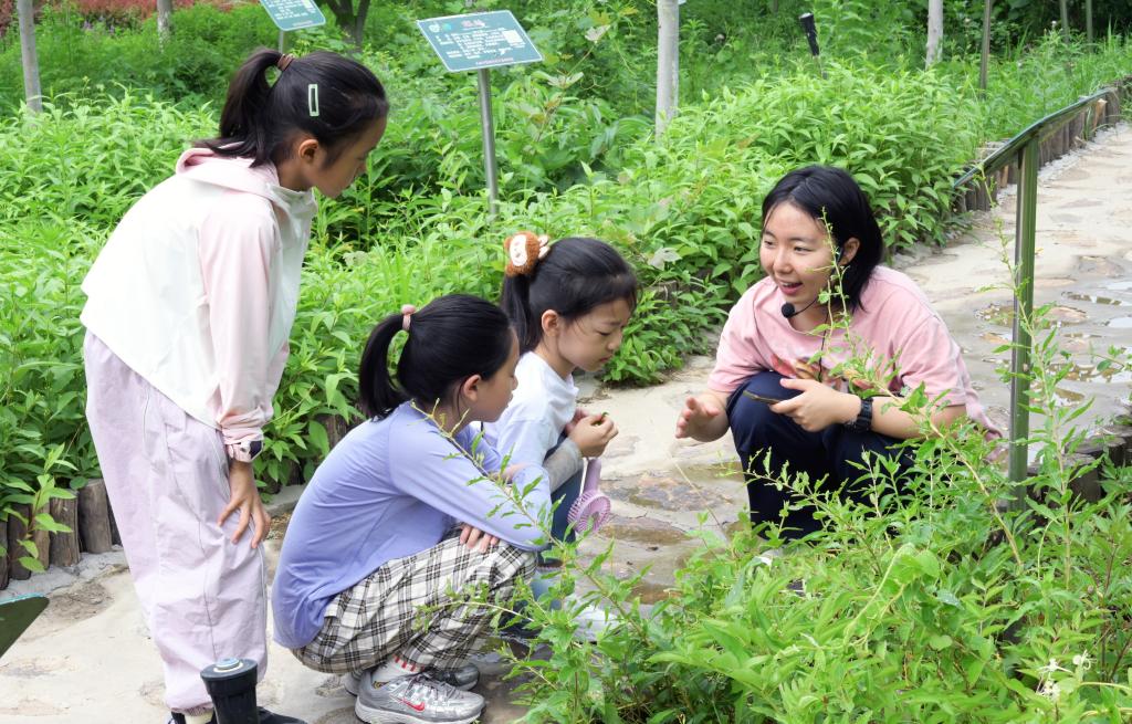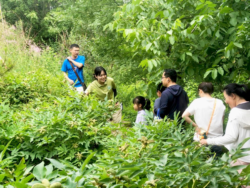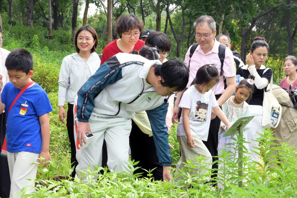 活动当天,四十组教职工家庭齐聚药山。在“如意药岭讲解团”学生讲解员的带领下,孩子们穿梭于郁郁葱葱的药材种植区,目光被一株株形态各异的植物吸引。讲解员结合端午传统习俗,介绍了艾蒿、佩兰、白芷等中药材的辨识要点与药用价值。孩子们还学习了连翘果实饱满,是清热解毒的良药;杜仲树皮粗糙、折断后可见银白色胶丝,有强筋健骨之效。孩子们边听边记,踊跃提问,在触摸叶片、观察花果的过程中,对中医药文化产生了浓厚兴趣。