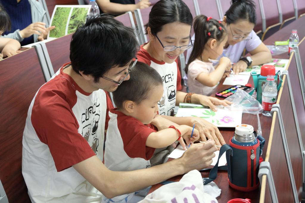 药山探访结束后,亲子家庭移步中药学院二楼阶梯教室,参与“中药植物涂画”活动。小朋友们手持画笔和《中药植物涂画册》,以药山上观察到的中药植物为灵感,用斑斓色彩描绘心中的本草世界。一笔一画间,既是对自然之美的捕捉,也是对中医药文化的童真诠释。