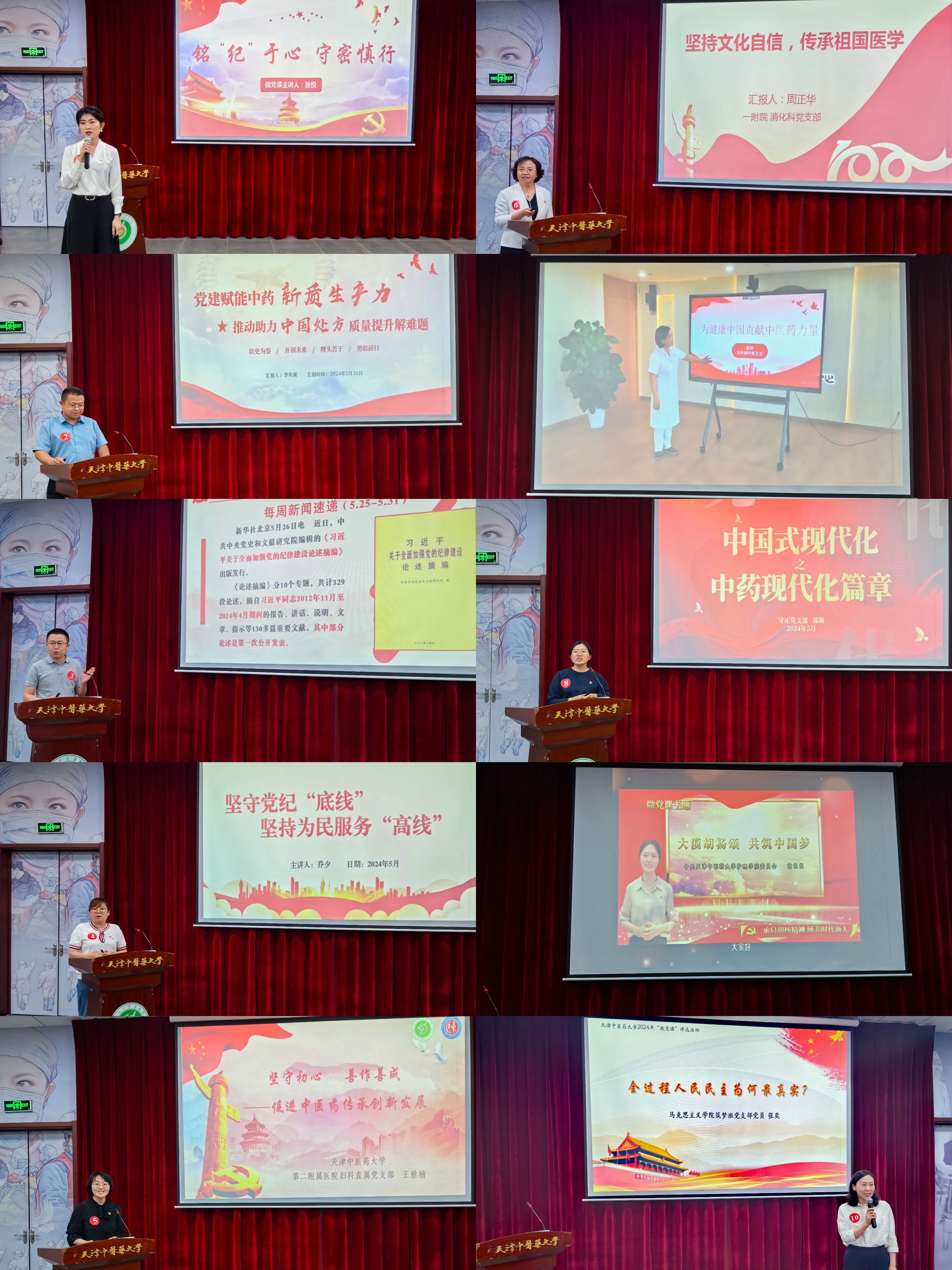 各位选手的展示聚焦贯彻落实习近平新时代中国特色社会主义思想和习近平总书记视察天津重要讲话精神,结合党纪学习教育,充分结合学校实际、专业特点和自身所长,以小切口折射大主题,突出思想性、教育性、实践性和创新性。经过精彩展示和激烈角逐,护理学院援疆教师高尚尚、马克思主义学院思政课教师张奕和驻校纪检监察组纪检监察员张达获一等奖,中药制药工程学院守正党支部书记郑琳、管理学院健管公管党支部书记张悦和第二附属医院研究生妇儿急党支部书记王雅楠获二等奖,第一附属医院消化科党支部书记、科室主任周正华、中药学院教工中药党支部书记李先宽、第一附属医院治未病健康管理中心党支部书记、治未病健康管理中心主任、国医堂主任董桦和附属保康医院景珩党支部书记乔夕获三等奖。