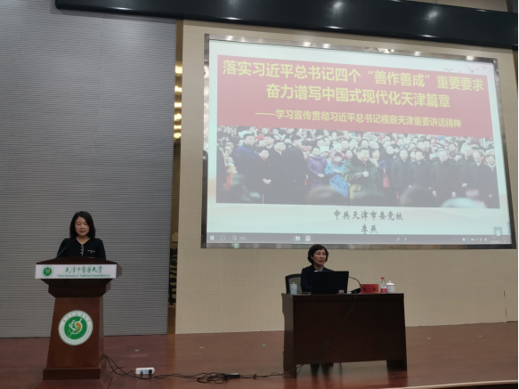 为深入学习贯彻习近平新时代中国特色社会主义思想,深刻领会、系统把握习近平总书记视察天津重要讲话精神,增强党员、干部高质量落实“四个善作善成”重要要求的能力本领,学校党委开办杏林干部学习大讲堂,特邀请市委党校李燕教授作题为《落实习近平总书记“四个善作善成”重要要求 奋力谱写中国式现代化天津篇章——学习宣传贯彻习近平总书记视察天津重要讲话精神》专题讲座。全校处级领导干部、教师党支部书记、思政课教师代表、政治人才学员、附院党员代表、组织员导航班学员、辅导员代表及学生党员代表等200余人参加,讲座由党委组织部副部长康瑛主持。