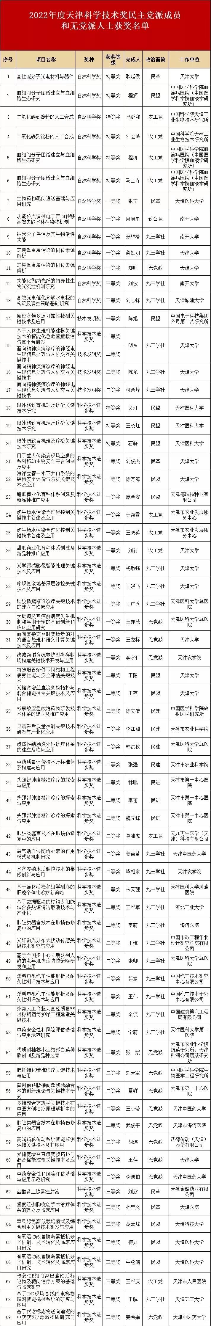 近日,天津政务信息发布了《天津市人民政府关于颁布2022年度天津市科学技术奖的决定》,其中我校党外人士参与的成果榜上有名。天津市委统战部专门发来贺信,向我校荣获二等奖的中药学院教授王小莹(无党派人士)、李遇伯(无党派人士)、中医药研究院研究员姜苗苗(九三学社社员)和荣获三等奖的中西医结合学院教授姜希娟(无党派人士)四位老师表示祝贺,对他们为推动科技创新和社会进步所付出的辛勤努力表示衷心感谢。市委统战部号召广大统一战线成员以获奖党外人士为榜样,沿着党的二十大擎画的宏伟蓝图,聚焦市委市政府“十项行动”,坚持以科技自立自强为己任,立时代潮头、发思想先声、攀科技高峰,肩负时代赋予的重任,为加快建设科技强国再创佳绩。