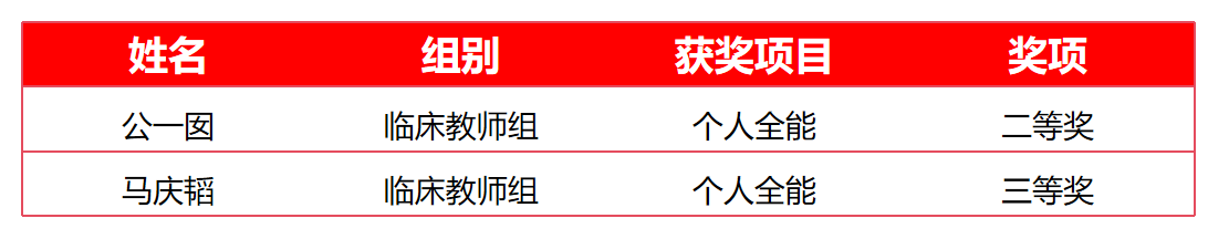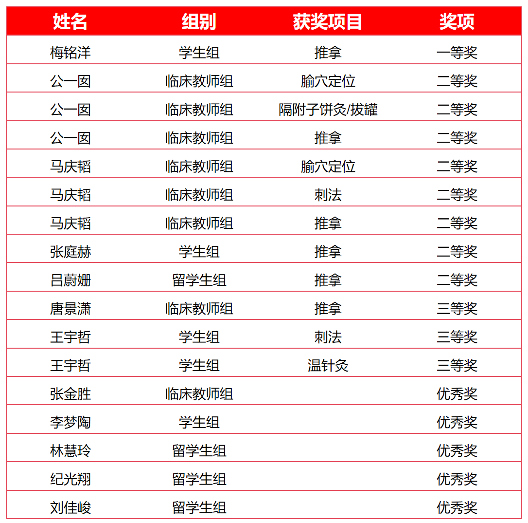 在个人决赛项目中,我校2位教师选手闯入决赛,表现亮眼:临床教师组公一囡老师荣获个人全能二等奖(全国第3名),马庆韬老师荣获个人全能三等奖(全国第7名)。此外,我校共斩获各类奖项21项,包括个人单项一等奖1项、二等奖8项、三等奖3项、优秀奖5项,首次实现多组别、全项目、广覆盖的优异成绩,全面展示了我校针灸推拿人才梯队建设的丰硕成果。