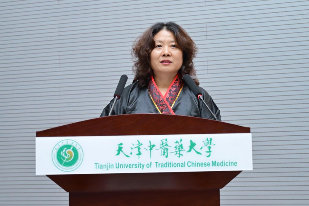 天津中医药第一附属医院李桂平主任作为导师代表发言。她提到学敏班的建立初心,希望同学们苦练技能,对生命保持敬畏,同时要抱有敢于创新的精神,精研医道,精修医德。