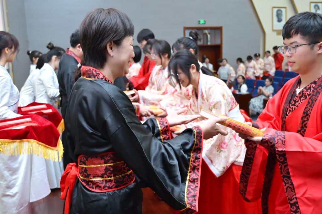 参会领导为12名导师代表颁发聘书,第四届“学敏班”学子依次上台向导师承拜师帖行拜师礼,导师向学生赠回徒贴及书籍。