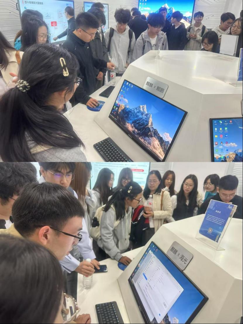 在麒麟软件有限公司的展厅里,天津校企合作吕总监详细介绍了作为中国操作系统核心力量,麒麟软件多年来致力技术创新,推动构建自主产业生态,赋能各行各业数字化转型升级的发展进程。我校师生体验了麒麟自主研发的纯国产操作系统,大家对建设科技强国充满信心。飞腾信息技术有限公司以“聚焦信息系统核心芯片,支撑国家信息安全和产业发展”为使命,飞腾团队以科学家精神书写国产CPU的崛起篇章。