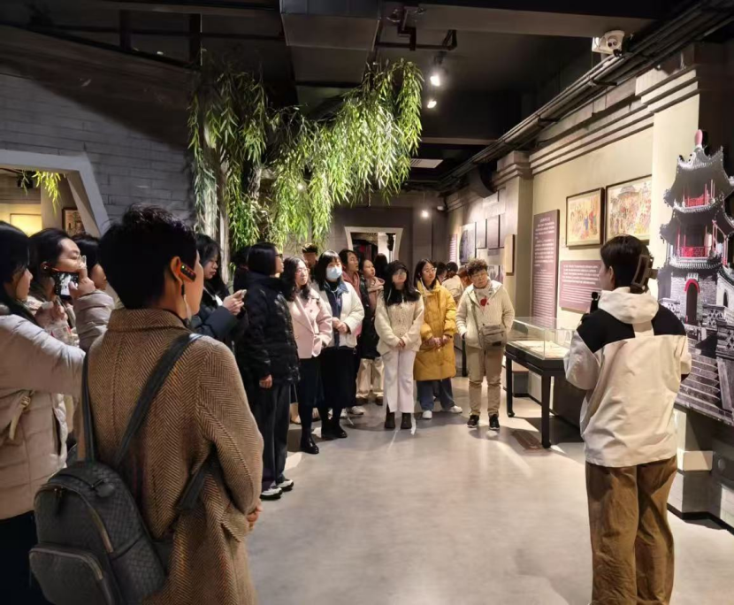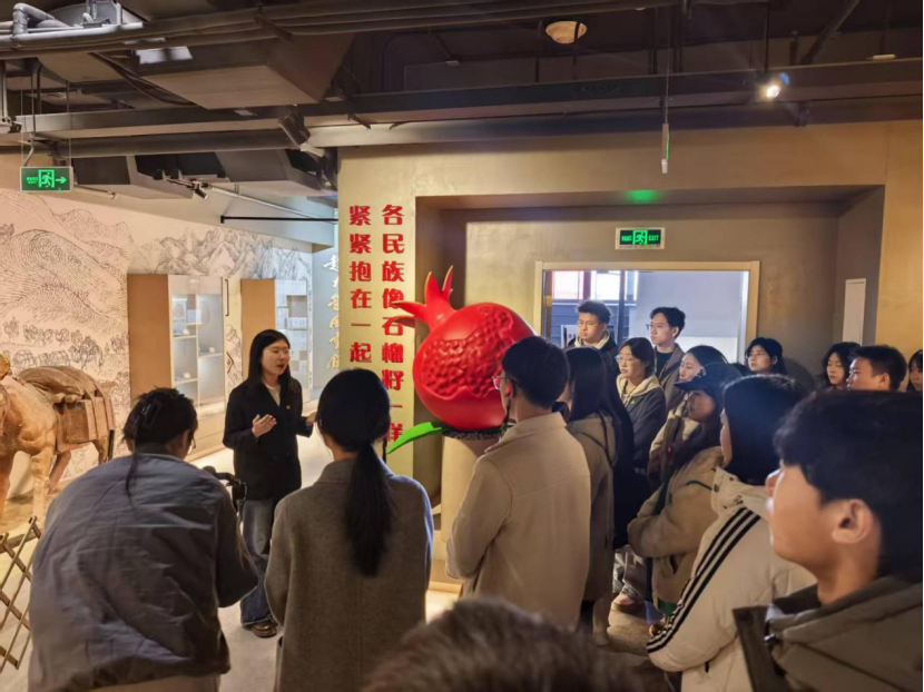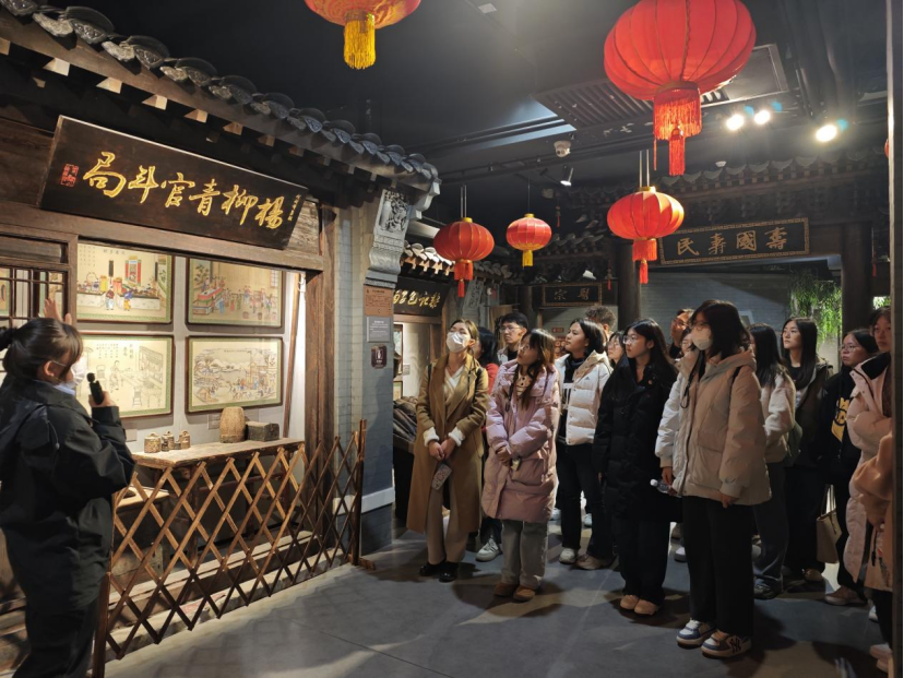 在杨柳青民俗文化馆,跟随着讲解员的脚步,师生们依次参观了“运河文化”“年画文化”“赶大营文化”等六大展区,通过文物展陈、场景复原和互动体验,全面了解了“年画之乡”的历史底蕴与文化交融特色,深刻感受了匠人精神与文化传承的力量。大家深刻感悟了中华优秀传统文化的深厚底蕴和无限魅力,身临其境体验了杨柳青商人沿丝绸之路开拓边疆、促进民族融合和文化繁荣发展的生动历史。来自学校红石榴宣讲团的成员还现场讲授了“医药同心—中医药文化铸牢中华民族共同体意识”微党课,表达了中医药由各民族共同创造、中医药由各民族共同传承、中医药由各民族共同发展”的思想,引导师生增强传承中医药文化的使命感、归属感和荣誉感,积极传承中医药文化,铸牢中华民族共同体意识。