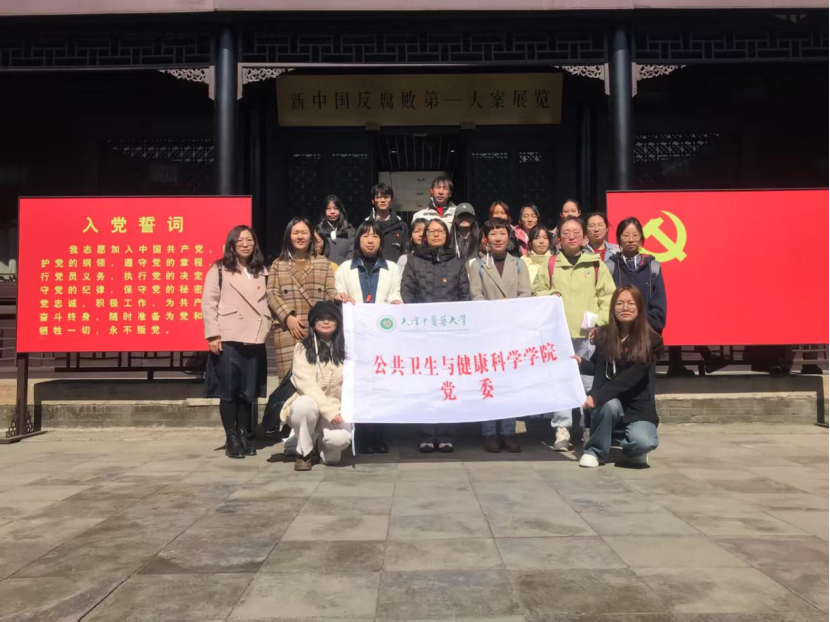 在石家大院廉政教育基地,在公共卫生与健康科学学院党委书记王芬的领誓下,全体师生党员面向党旗庄严宣誓,重温入党誓词,铮铮誓言彰显了对党忠诚与使命担当的坚定信念。教育基地以“新中国反腐败第一大案”为主线,通过复原刘青山、张子善的办公场景、实物展陈与警示案例,用一件件铁证如山的实物、一幅幅发人深省的照片、一组组触目惊心的数字揭露了党员干部腐化堕落的深刻教训。讲解员结合党史中的纪律建设历程,强调“贪廉一念间,荣辱两重天”的警示意义,教育师生党员筑牢拒腐防变的思想防线。