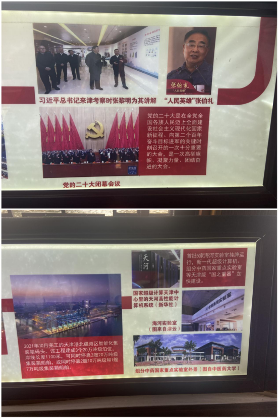 全体党员驻足观看展览中“人民英雄”荣誉称号获得者、我校名誉校长张伯礼院士、组分中药国家重点实验室和海河实验室的先进事迹,大家倍感荣耀、深受鼓舞。在码头党旗处,大家重温入党誓词,进一步坚定理想信念,砥砺初心使命。