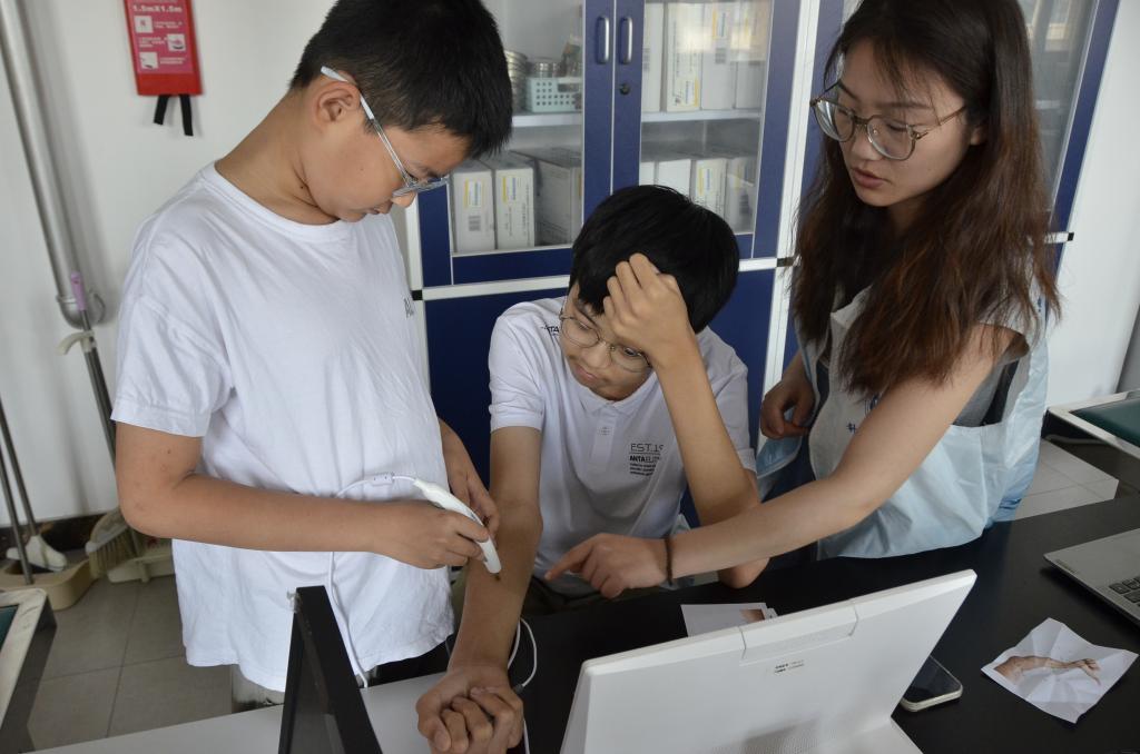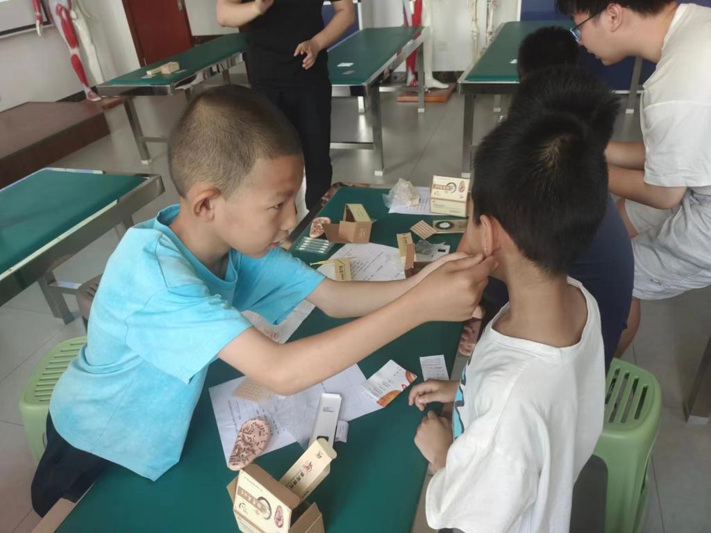 在“小儿推拿”项目中,学生们与家长共同学习了温和的推拿手法,亲身体验了这一古老的中医疗法如何促进儿童身心健康。通过“穴位探真”,孩子们使用经穴电阻探测仪,探索经络穴位的电阻特性,对中医的经络系统有了直观理解。“明目归源”则让参与者了解到中医药在儿童青少年近视防治中的重要作用。利用3Dbody和VR技术的“经络秘境”项目,让孩子们仿佛置身于中医经络的世界,感受到传统与现代科技的完美融合。“井护青苗”项目通过手指井穴操,帮助青少年调节情绪,增强大脑功能,体现了中医文化传承的重要性。“经穴桌游”则以游戏的方式,让孩子们在轻松愉快的氛围中学习针灸知识。“字里藏医”项目引导学生从汉字的起源入手,探索医学术语的含义,领悟汉字与中医文化的深厚联系。“耳穴健脑”通过刺激耳穴来提神醒脑,展示了中医的神奇疗效。“穴位侦探”则是一场寓教于乐的寻宝游戏,学生们在比赛中学习常用穴位的定位方法,增加了活动的趣味性和互动性。