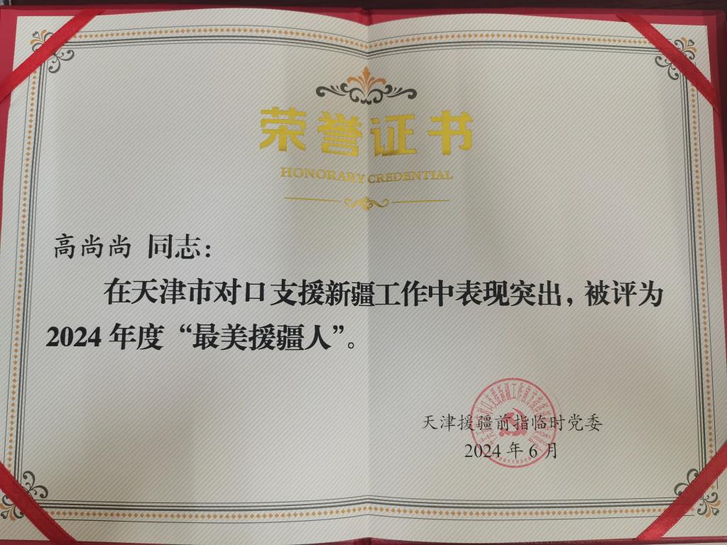 近日,在庆祝中国共产党成立103周年之际,我校援疆教师高尚尚在天津援疆前指临时党委召开2024年“两优一先”和第二季度“最美援疆人”表彰会上荣获“最美援疆人”的殊荣。这一荣誉是为了表彰先进、鼓舞斗志,激励广大援疆干部人才扎根边疆、建功立业,更是对高老师无私奉献、倾力援疆工作的高度肯定,也彰显了她作为一名教育工作者的高尚品质和坚定信念。