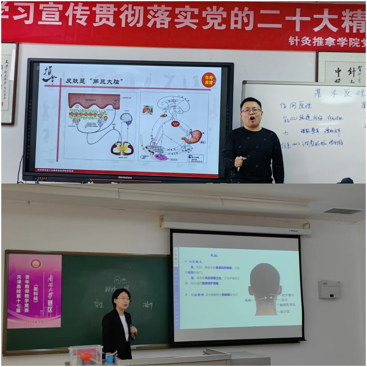 在近两届教师教学比赛,针灸推拿学院教师青教赛获得天津市一等奖3人次,教学创新比赛获天津市一等奖第一名、推荐国赛2人次,较好体现了学院教育质量提升方面的建设成效。