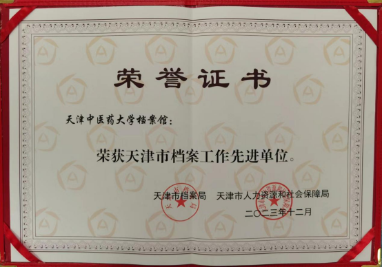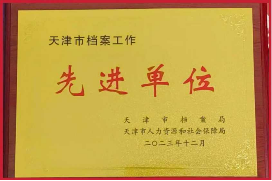 天津市档案工作先进单位荣誉证书