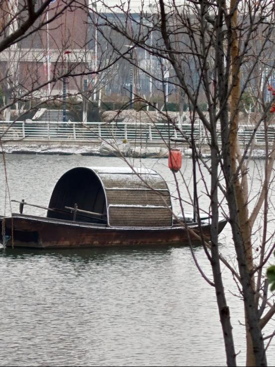 湖边的船静静泊雪