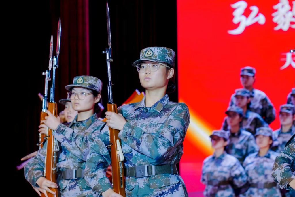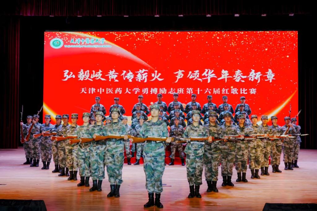 天津中医药大学国旗护卫队带着整齐划一的枪操表演与气势恢宏嘹亮的红歌压轴登场。他们的刀法与枪术刚劲利落,每一次挥动都虎虎生风,每招每式尽显天中国护人的本色。队员们的歌声从深情诉说到激昂高亢,既再现了砥砺前行的光辉岁月,更凝聚起新时代奋勇向前的磅礴力量。