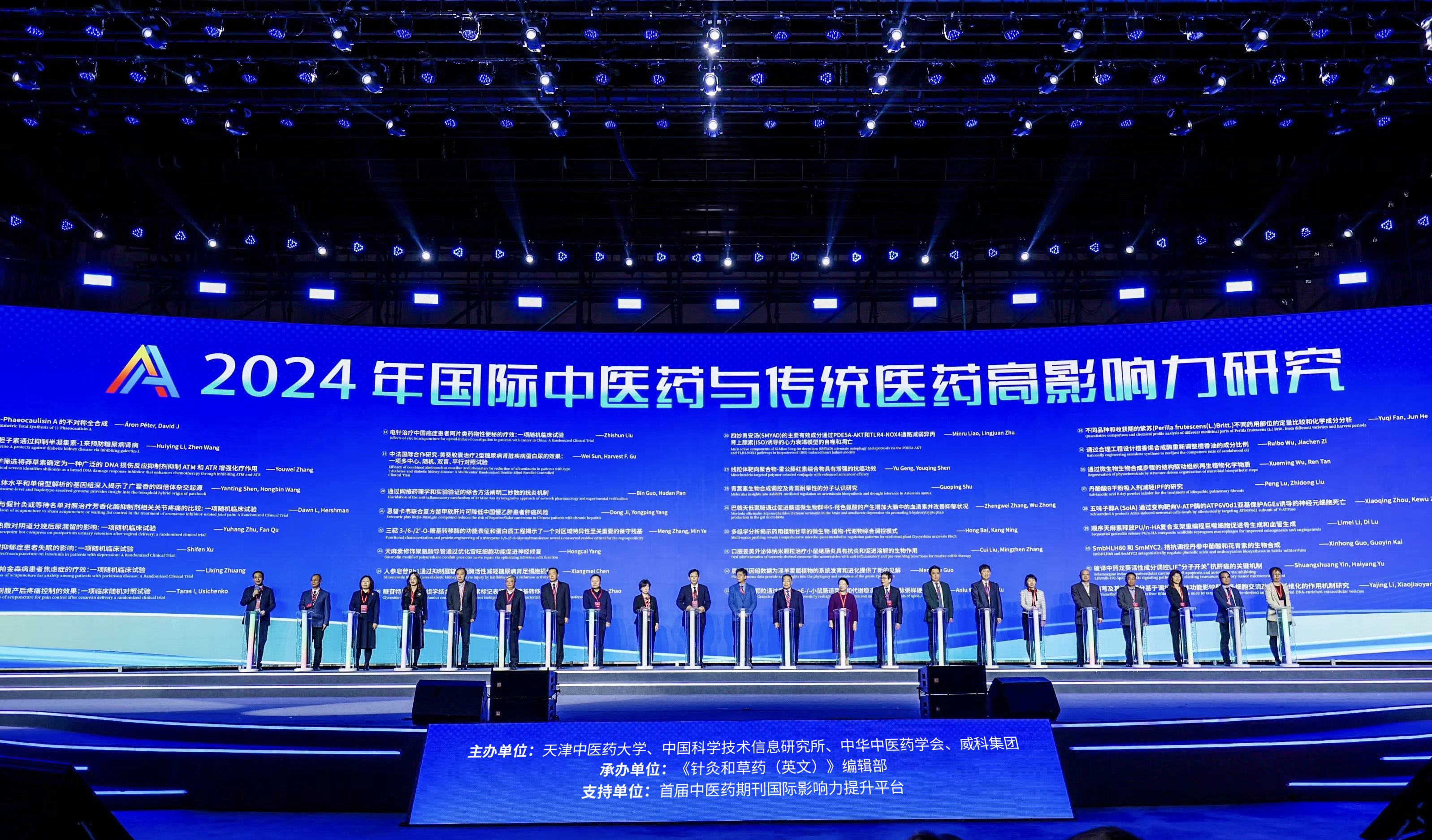 大会开幕式举行了“2024年国际中医药与传统医药高影响力研究”发布仪式。为促进中医药传承创新发展,促进全球共享中医药现代化研究成果,由天津中医药大学、中国科学技术信息研究所、中华中医药学会、威科集团主办,《针灸和草药(英文)》开展了“2024年国际中医药与传统医药高影响力研究”遴选。经汇集遴选库、提名库、补充库所有研究,通过网络公开投票、小同行专家投票、行业专家审议共识等流程,最终形成了“2024年国际中医药与传统医药高影响力研究”50项。50项研究涉及临床研究、针灸基础研究、中药药理研究、药物化学研究、生物合成研究、药物制剂研究和中药资源研究7个领域。其中,37项研究由中国独立完成;3项研究由国外单位完成,10项研究由国际合作完成。