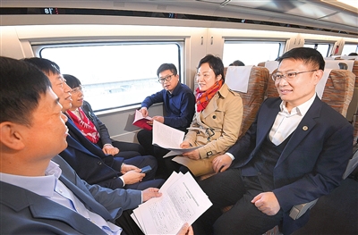 住津全国政协委员在赴京列车上讨论提案。 本报记者 许凯 摄