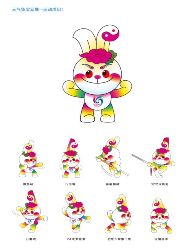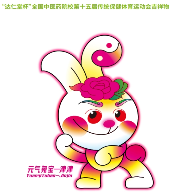 为全面展现本届赛会内涵和特色,全国中医药院校第十五届传统保健体育运动会筹委会特邀具有丰富设计经验的天津美术学院专业团队承担赛会会徽和吉祥物设计。其中,会徽以红色与蓝绿色渐变为主体颜色,整体造型将阿拉伯数字“15”与太极图形创意同构,整体形态恰似展翅翱翔的“精卫鸟”,彰显津门之神韵同时,也体现了此届赛会的时间属性、特质、赛会主题和理念;吉祥物取名“元气兔宝-津津”,取材“玉兔捣药”故事,元气兔宝头饰月季花(天津市花)传递出主办地天津,整体形象采用杨柳青年画的艺术表现手法,色彩艳丽、造型简洁生动,传递出了鲜明的地方文化特色。