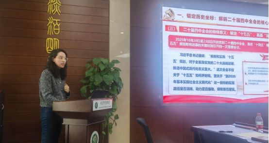 宣讲环节,乔显喆老师以《深学笃行党的二十届四中全会精神勇担“十五五”现代化新使命》为题,从全会核心内涵、“十五五”规划重大意义、“十五五”时期经济社会发展重点任务三个维度,系统阐释了全会精神的核心要义和实践要求,为与会人员精准把握精神实质、凝聚思想共识提供了指导。